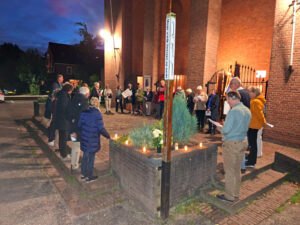 Tijdens een Vredeswandeling door De Bilt kwamen we al wandelend met elkaar in gesprek over het thema. De wandeling eindigde bij de Michaëlkerk, waar een Vredesvesper werd gehouden, met ruimte voor stilte, bezinning en gezang. De dienst werd afgesloten met het vredesgebed van Franciscus bij de vredespaal. Het was een inspirerende avond; een ingetogen protest tegen al het geweld in de wereld. De volgende foto's geven een indruk van de wandeling en het afsluitende gebed bij de Vredespaal.